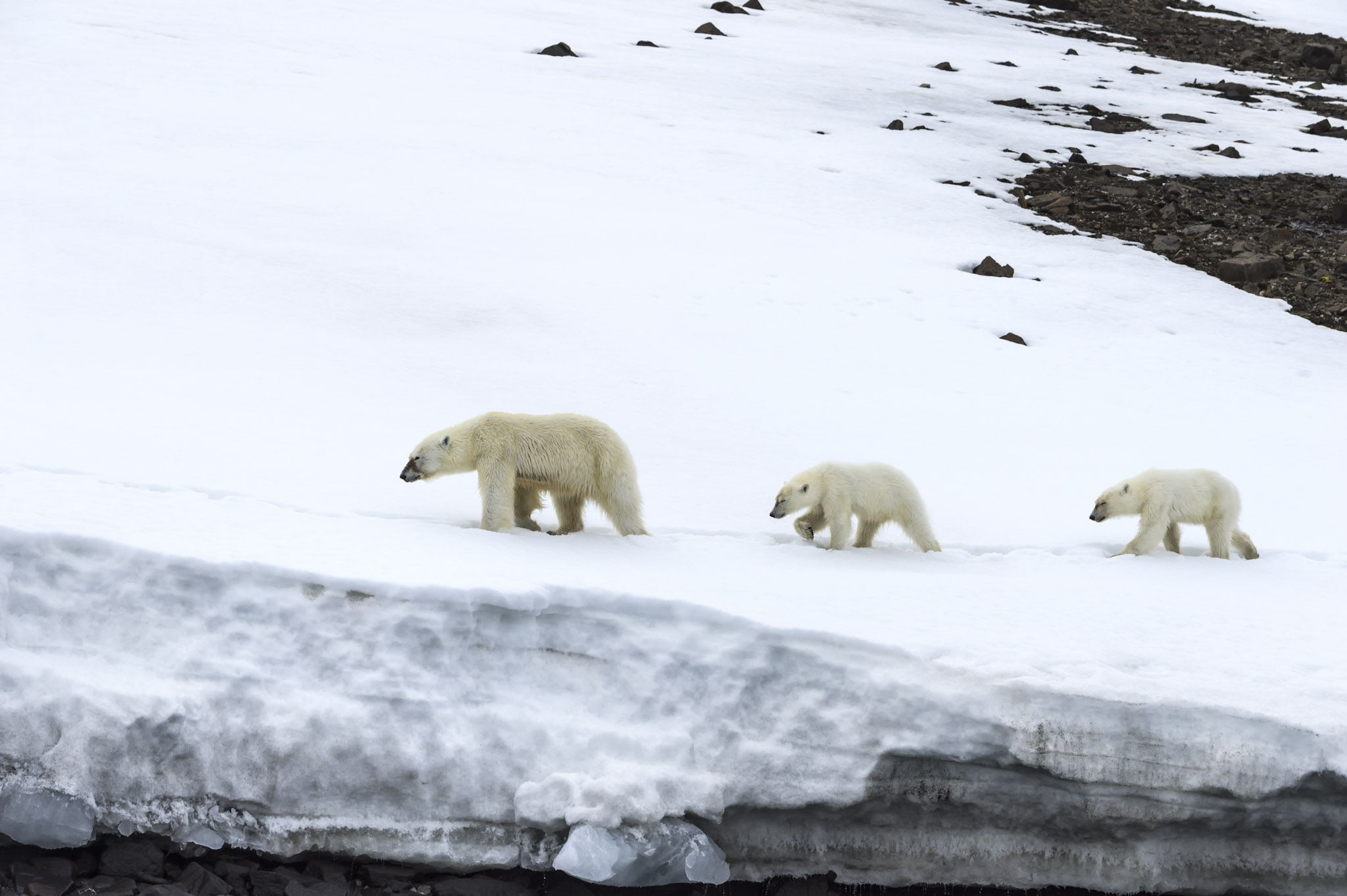 Au Spitzberg, c’est justement en été qu’on le rencontre le plus souvent à terre. Il est venu par la banquise et attend simplement qu’elle revienne. Cette attente peut durer longtemps. Plusieurs semaines, parfois plusieurs mois. Il se déplace moins, consomme peu d’énergie et devient un opportuniste.