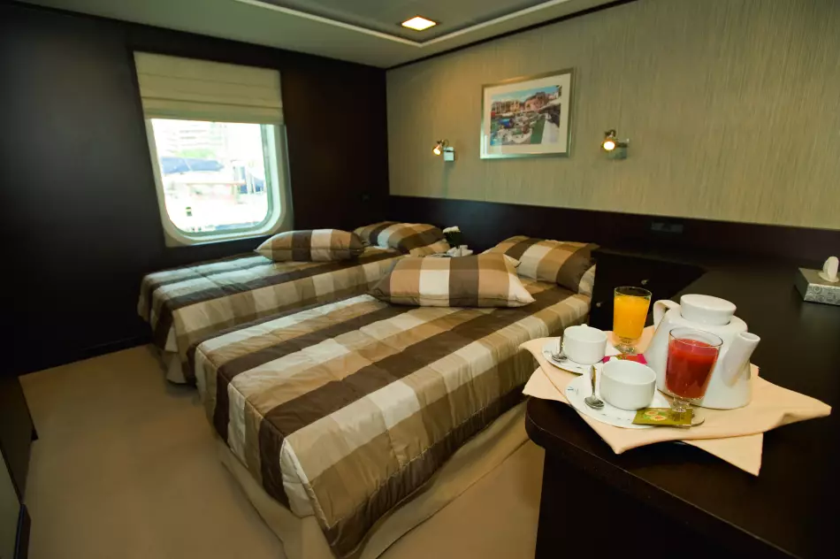 Le yacht dispose de cabines spacieuses, allant de la cabine standard à la suite luxueuse, toutes équipées de commodités modernes. Les passagers apprécieront le confort de leur cabine extérieure, équipée d’une salle de bain privative et d’un coffre-fort pour sécuriser leurs effets personnels.
